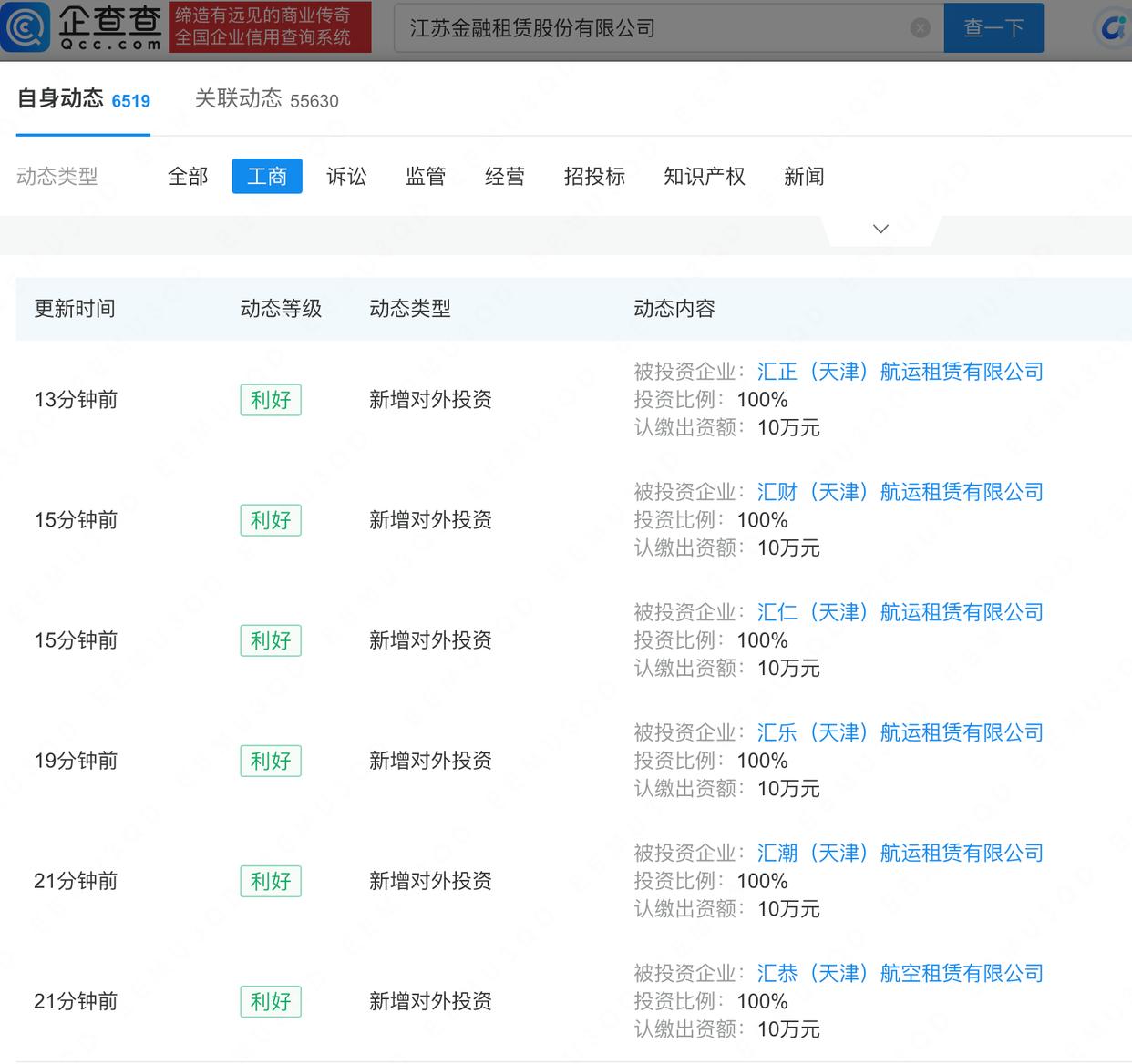 近日,汇正(天津)航运租赁有限公司、汇财(天津)航运租赁有限公司、汇仁(天津)航运租赁有限公司、汇乐(天津)航运租赁有限公司、汇潮(天津)航运租赁有限公司、汇恭(天津)航空租赁有限公司成立,注册资本均为10万元。企查查股权穿透显示,上述公司均由江苏金租(600901)全资持股。