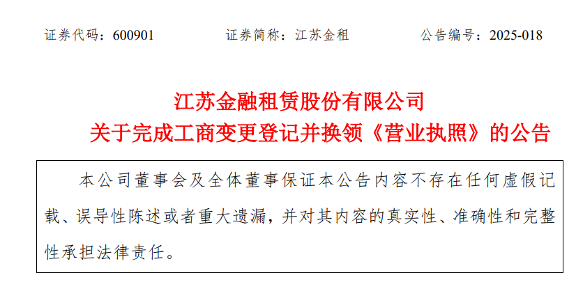 4月10日,江苏金租发布关于完成工商变更登记并换领《营业执照》的公告。