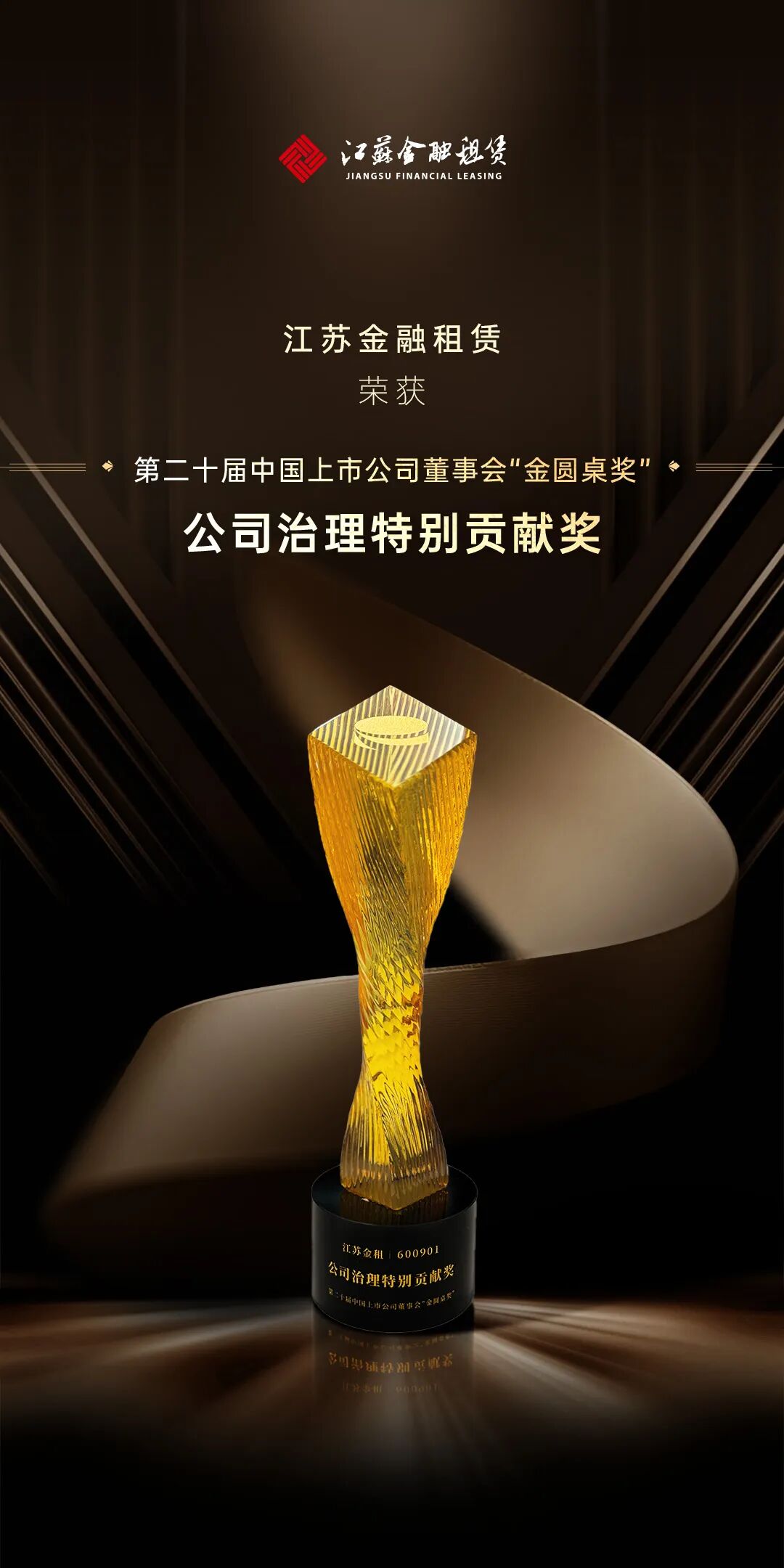 近日,第二十届中国上市公司董事会“金圆桌奖”颁奖典礼在江苏省江阴市举行。基于在公司治理方面的创新实践与突出成效,江苏金融租赁股份有限公司(以下简称“ 江苏金租 ”)荣获本届“金圆桌奖”之公司治理特别贡献奖。
