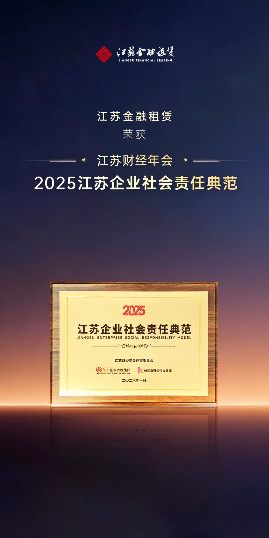 1月31日,由新华日报主办的“向新向优,笃行致远——第四届江苏财经年会”在南京举行。会议汇聚政府相关部门、知名企业、金融机构及经济学界的众多嘉宾,围绕全省经济高质量发展目标与“十五五”时期发展蓝图,碰撞思想、共谋良策。会上,江苏金融租赁股份有限公司(以下简称“江苏金租”)荣获“2025江苏企业社会责任典范”奖项。
