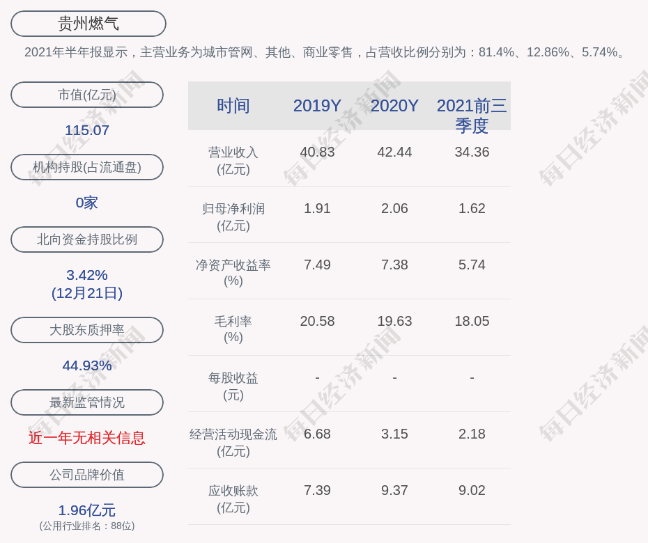 2021年半年报显示,贵州燃气的主营业务为城市管网、其他、商业零售,占营收比例分别为:81.4%、12.86%、5.74%。