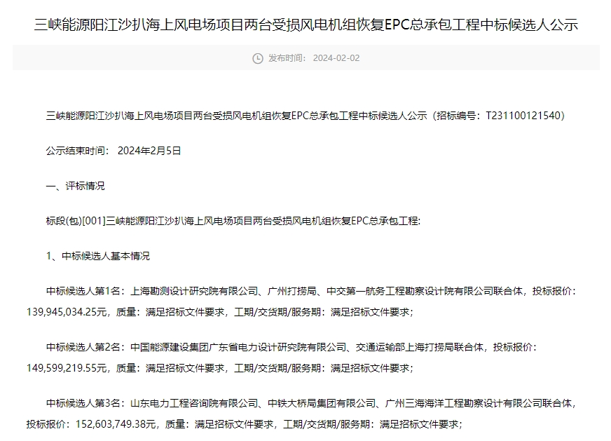 2月2日,三峡能源发布《三峡能源阳江沙扒海上风电场项目两台受损风电机组恢复EPC总承包工程中标候选人公示》,公示显示,中标候选人第1名为上海勘测设计研究院有限公司、广州打捞局、中交第一航务工程勘察设计院有限公司联合体,投标报价139945034.25元。