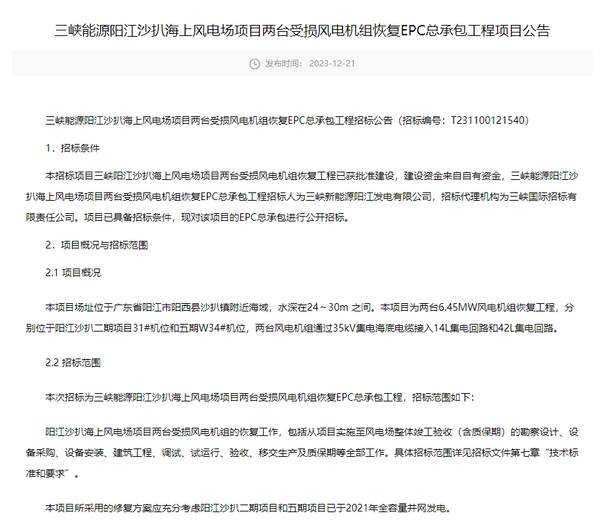2023年12月21日,三峡能源发布《阳江沙扒海上风电场项目两台受损风电机组恢复EPC总承包工程项目招标公告》,招标内容为:阳江沙扒海上风电场项目两台受损风电机组的恢复工作,包括从项目实施至风电场整体竣工验收(含质保期)的勘察设计、设备采购、设备安装、建筑工程、调试、试运行、验收、移交生产及质保期等全部工作。