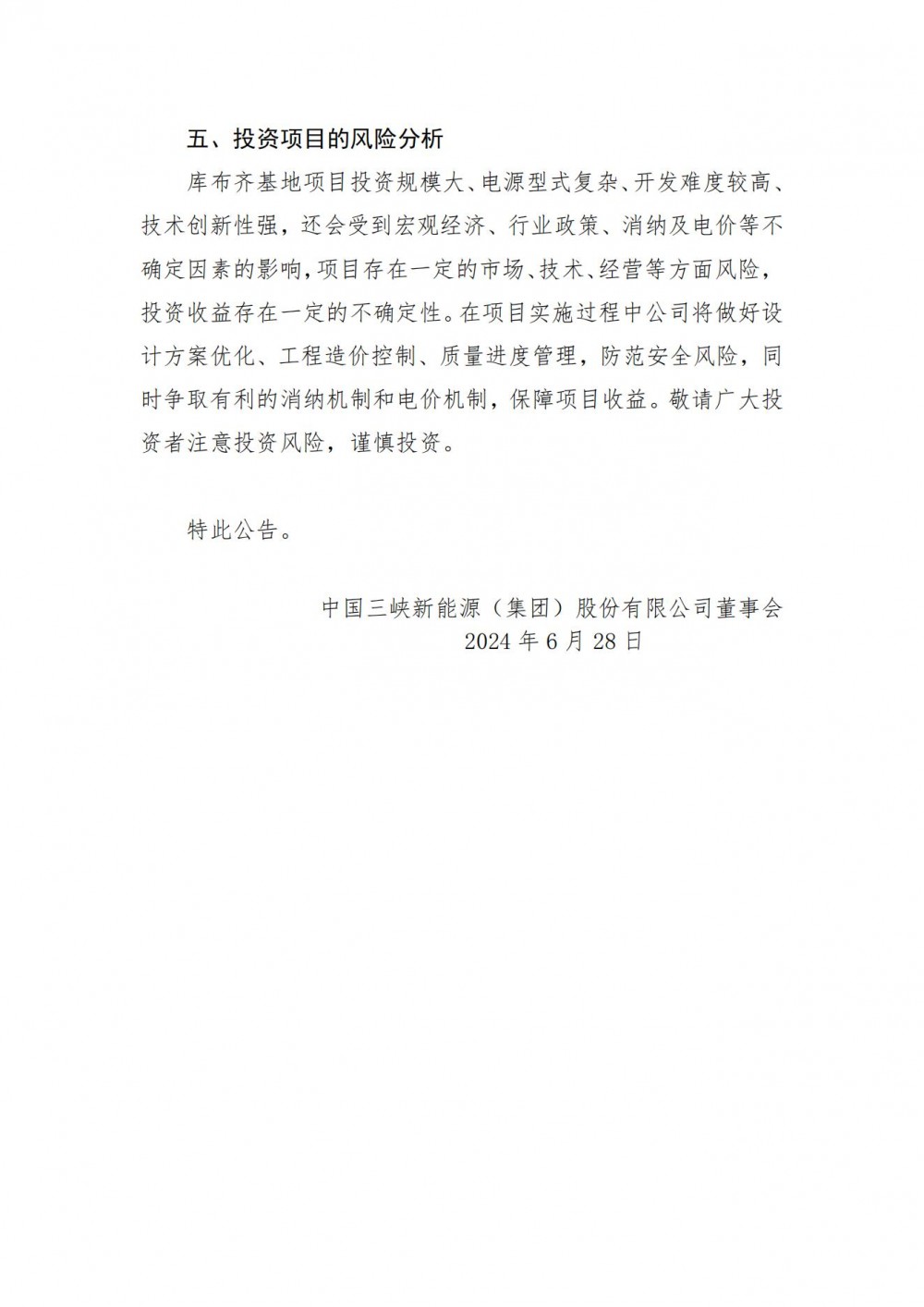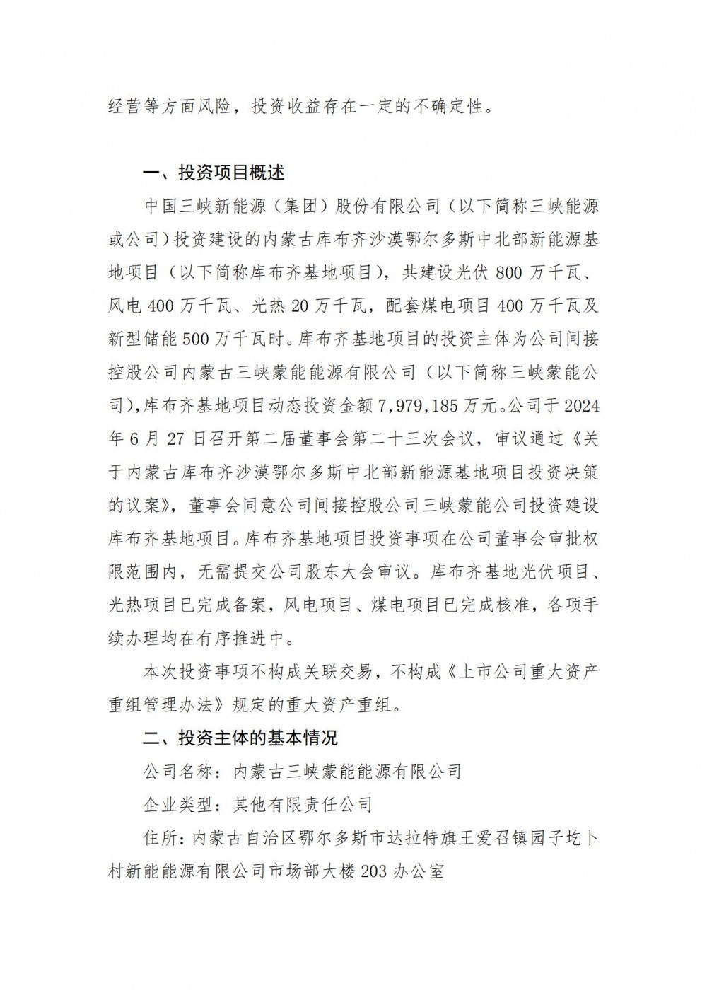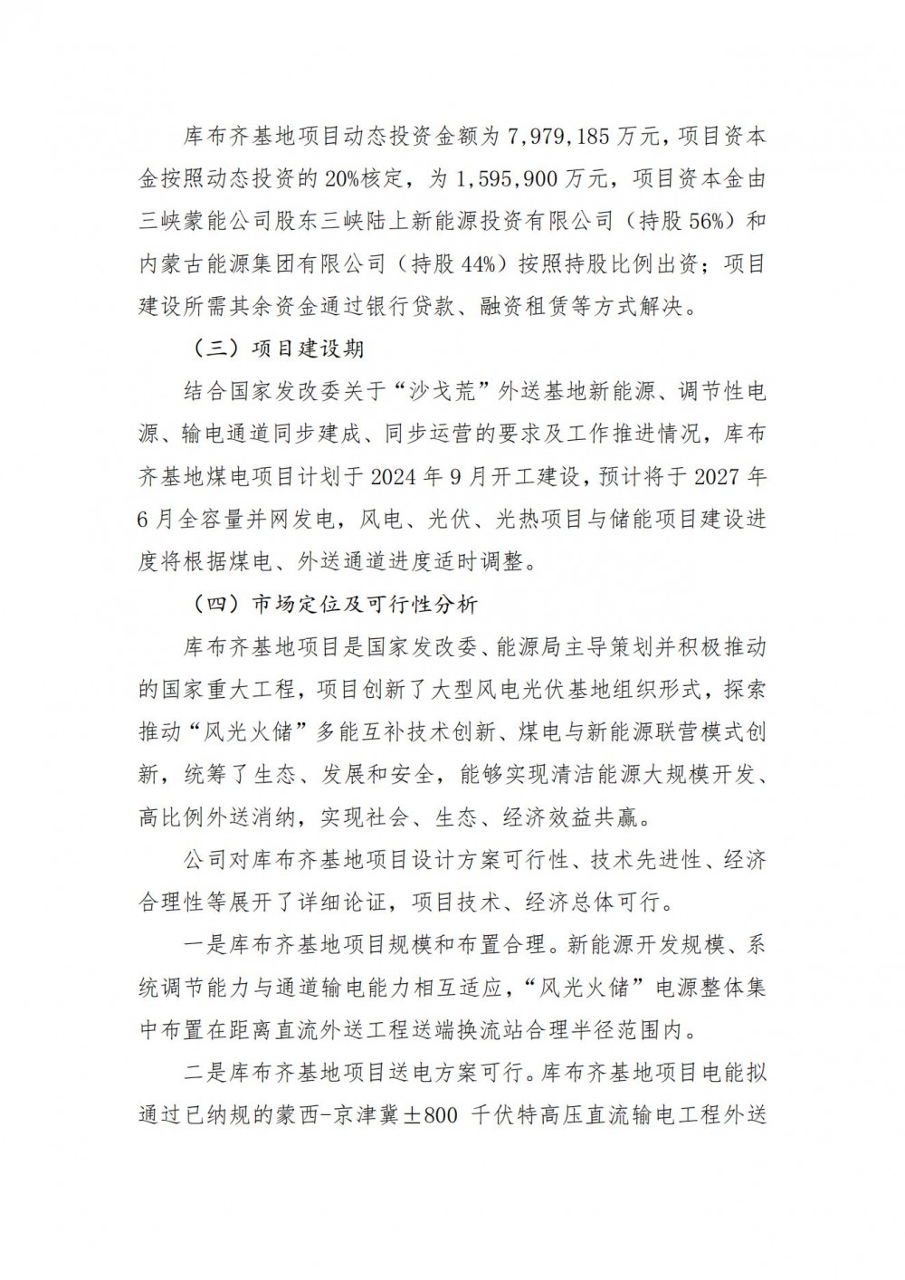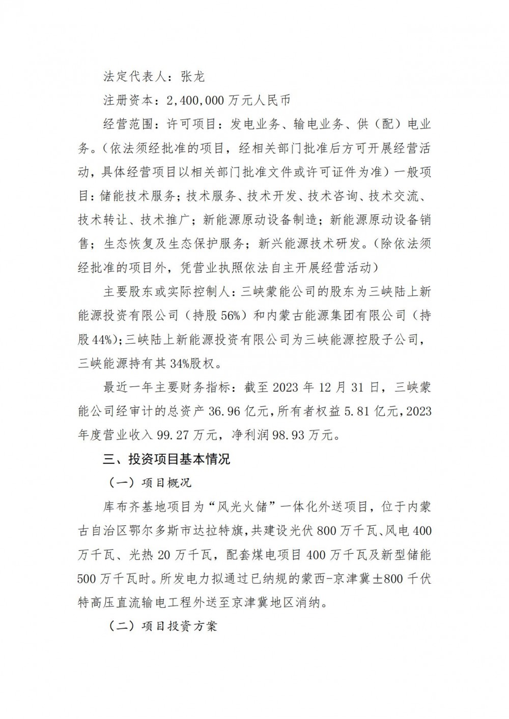 库布齐基地项目的投资主体为公司间接控股公司内蒙古三峡蒙能能源有限公司(以下简称三峡蒙能公司),库布齐基地项目动态投资金额7,979,185万元。公司于 2024年6月27日召开第二届董事会第二十三次会议,审议通过《关于内蒙古库布齐沙漠鄂尔多斯中北部新能源基地项目投资决策的议案》,董事会同意公司间接控股公司三峡蒙能公司投资建设库布齐基地项目。库布齐基地项目投资事项在公司董事会审批权限范围内,无需提交公司股东大会审议。库布齐基地光伏项目、光热项目已完成备案,风电项目、煤电项目已完成核准,各项手续办理均在有序推进中。