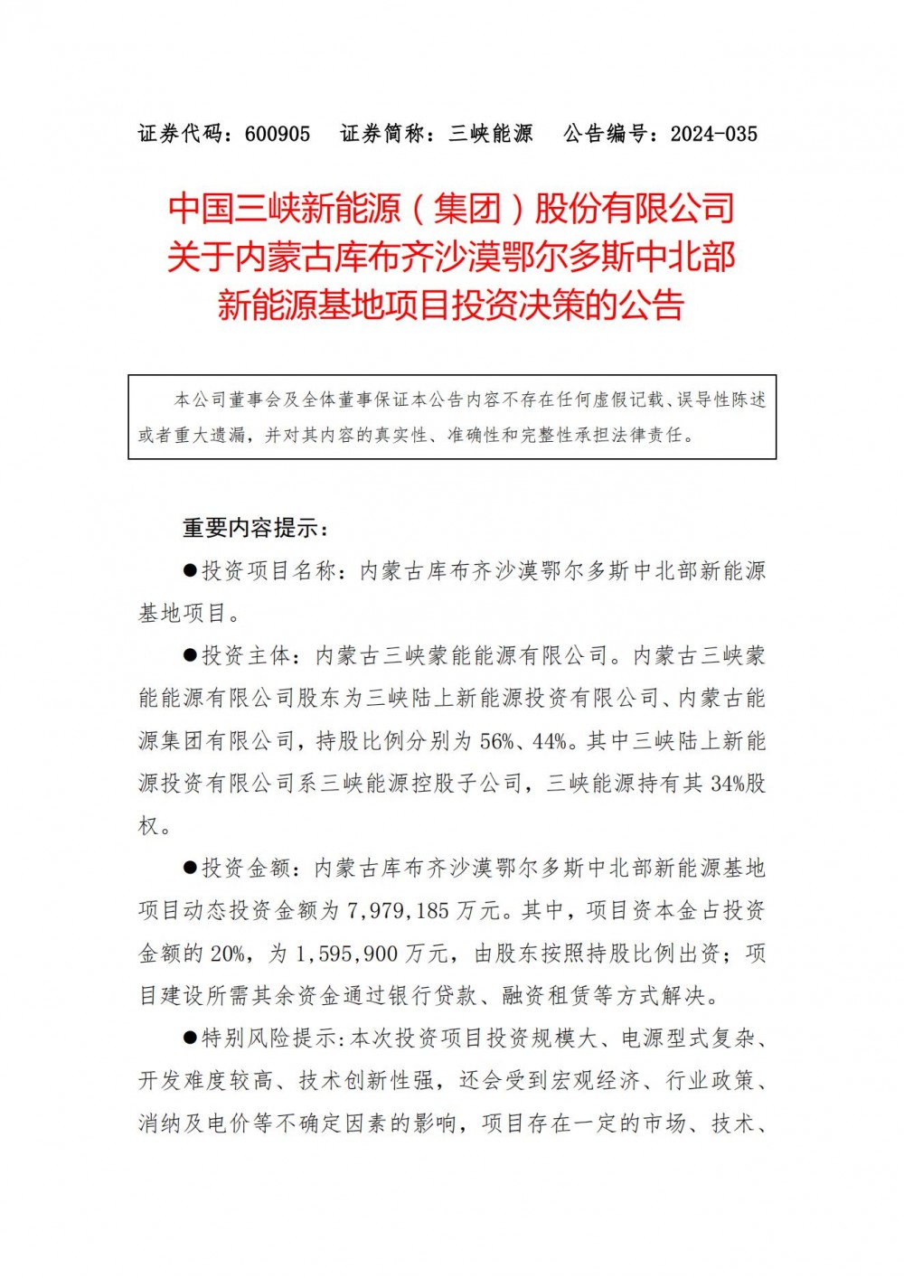 6月27日晚间,三峡集团发布关于内蒙古库布齐沙漠鄂尔多斯中北部新能源基地项目投资决策的公告。