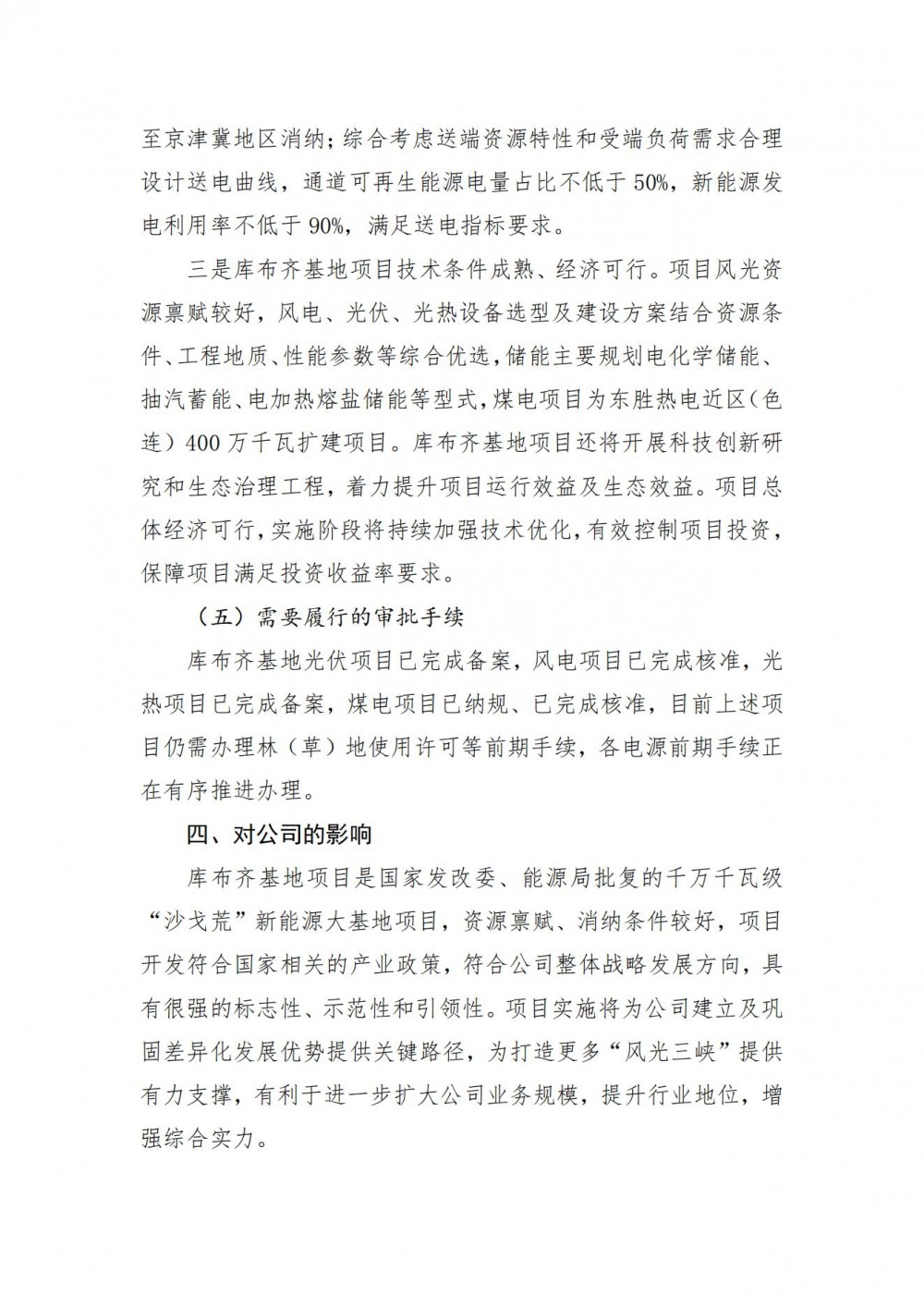 公告进一步表示,库布齐基地项目是国家发改委、能源局主导策划并积极推动的国家重大工程,项目创新了大型风电光伏基地组织形式,探索推动“风光火储”多能互补技术创新、煤电与新能源联营模式创新,统筹了生态、发展和安全,能够实现清洁能源大规模开发、高比例外送消纳,实现社会、生态、经济效益共赢。