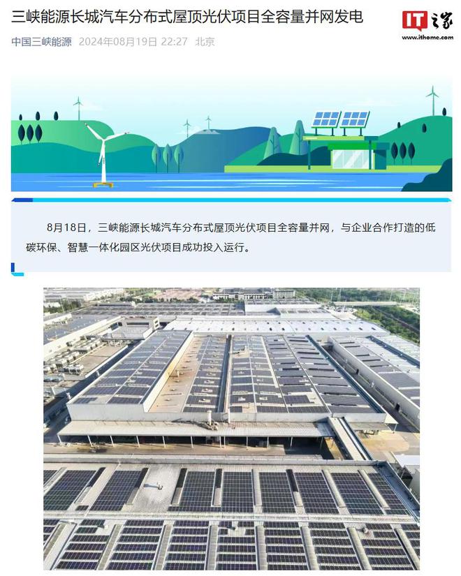 中国三峡能源今日发文宣布,三峡能源长城汽车分布式屋顶光伏项目于昨日(8 月 18 日)全容量并网,与企业合作打造的低碳环保、智慧一体化园区光伏项目成功投入运行。