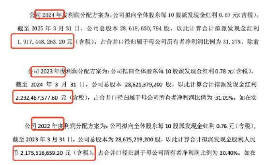 不过,细看数据会发现,2024年分红已是近三年最低点。2023年和2022年分别分红22.32亿元、21.76亿元。今年19.17亿元的分红金额,比前两年缩水约2-3亿元。