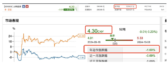 截至8月12日,三峡能源股价报收于4.3元/股,总市值1229.27亿,今年以来股价下降1.60%。
