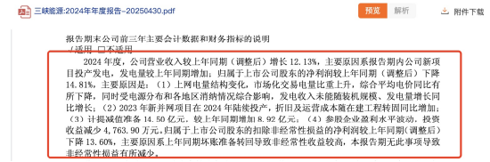 一是上网电量结构变化,市场化交易电量比重上升,综合平均电价同比有所下降,加上电源分布和各地区消纳情况的影响,发电收入没能随装机规模、发电量增长同比增长;