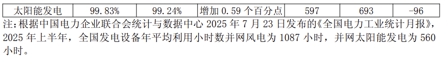 2025年上半年,公司发电设备平均利用小时数有所下降,主要受消纳等因素影响,青海、内蒙古、甘肃等区域消纳压力相对较大。其中风电平均利用小时为1146小时,较上年减少97小时;太阳能发电平均利用小时为597小时,较上年减少96小时;公司风电、太阳能发电利用小时数分别高于全国均值59小时、37小时。风电发电厂可利用率为99.21%,太阳能发电厂可利用率99.83%,较上年均有所上升。