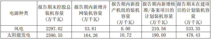 报告期内,公司新增并网装机218.07万千瓦,其中风电新增并网53.81万千瓦,太阳能发电新增并网164.26万千瓦。新增获取核准/备案项目容量400.56万千瓦,在建项目计划装机容量合计1381.78万千瓦。报告期末公司待建新能源项目计划装机容量2696.49万千瓦,其中风电1143.13万千瓦,太阳能发电1543.36万千瓦,储能10万千瓦。