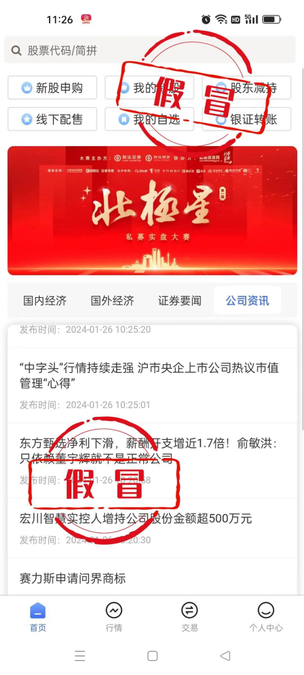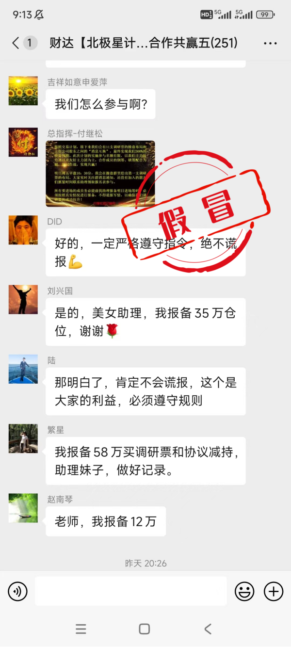 近日财达证券股份有限公司(以下简称“公司”或“我司”)接到举报,有不法分子冒用我司商标“财达北极星”名义诱骗投资者加入企业微信群(群名称:财达《北极星》四、财达【北极星计划】合作共赢五等),向投资者散布虚假投资承诺,引诱投资者下载假冒我司官方软件APP:“CDZH”等转账实施诈骗。此行为实为冒用我司名义进行的违法行为,严重侵害了我司的名誉,构成侵权,造成不良影响,损害了公共利益,涉嫌犯罪。对此,我司严正声明如下: