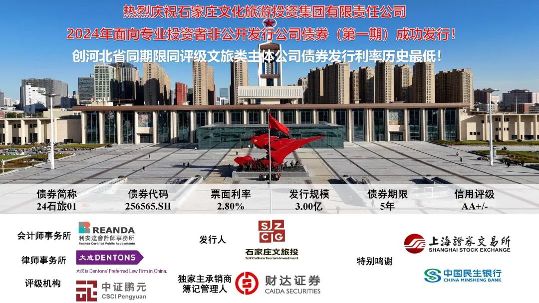 12月2日,石家庄文化旅游投资集团有限责任公司2024年面向专业投资者非公开发行公司债券(第一期)于上海证券交易所顺利簿记发行。此次发行由财达证券担任独家主承销商,发行规模为3亿元,期限为5年,票面利率为2.80%,开创了河北省同期限同评级文旅类主体公司债券票面利率的历史最低。