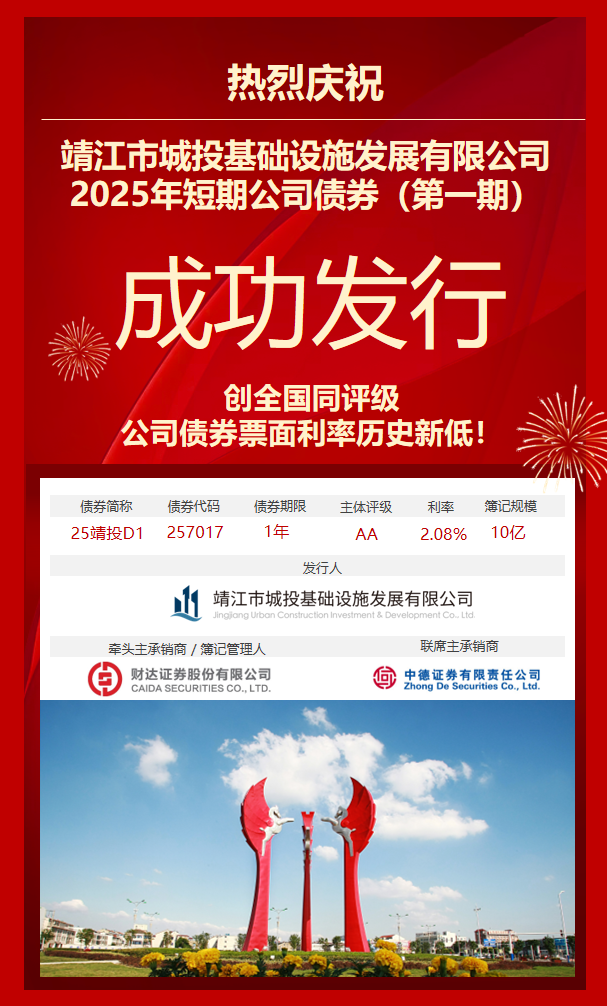 1月3日,靖江市城投基础设施发展有限公司(以下简称“靖江城投”)10亿元短期公司债券在上海证券交易所成功发行。此次发行由财达证券担任牵头主承销商,本期债券票面利率为2.08%,主体评级AA,创全国同评级公司债券票面利率历史新低。