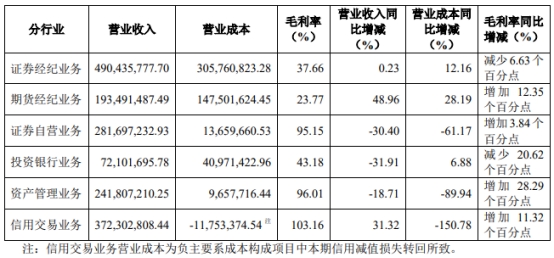 分行业来看,证券经纪业务营收为4.90亿元,同比增长0.23%,毛利率37.66%,同比减少6.63个百分点;期货经纪业务营收为1.930亿元,同比增长48.96%,毛利率23.77%,同比增加12.35个百分点;证券自营业务营收为2.82亿元,同比减少30.40%,毛利率95.15%,同比增加3.84个百分点;投资银行业务营收为7210.17万元,同比减少31.91%,毛利率43.18%,同比减少20.62个百分点;资产管理业务营收为2.42亿元,同比减少18.71%,毛利率96.01%,同比增加28.29个百分点;信用交易业务营收为3.72亿元,同比增长31.32%,毛利率103.16%,同比增加11.32个百分点。