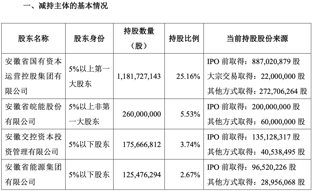 具体来看,安徽国控拟以大宗交易方式减持不超过5000万股,皖能电力拟以集中竞价方式减持不超过7046.5万股,安徽交控拟以集中竞价方式减持不超过3473.7万股,安徽能源拟以集中竞价方式减持不超过2348.83万股。其中安徽国控、安徽交控的拟减持股份来自配股认购,而皖能电力、安徽能源的拟减持股份则是在IPO前取得。