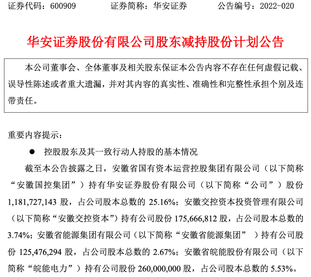 公告显示,此次参与减持华安证券的四家股东分别是:控股股东安徽省国有资本运营控股集团有限公司(简称“安徽国控”),及其三家一致行动人安徽交控资本投资管理有限公司(简称“安徽交控”)、安徽省能源集团有限公司(简称“安徽能源”)、安徽省皖能股份有限公司(简称“皖能电力”)。