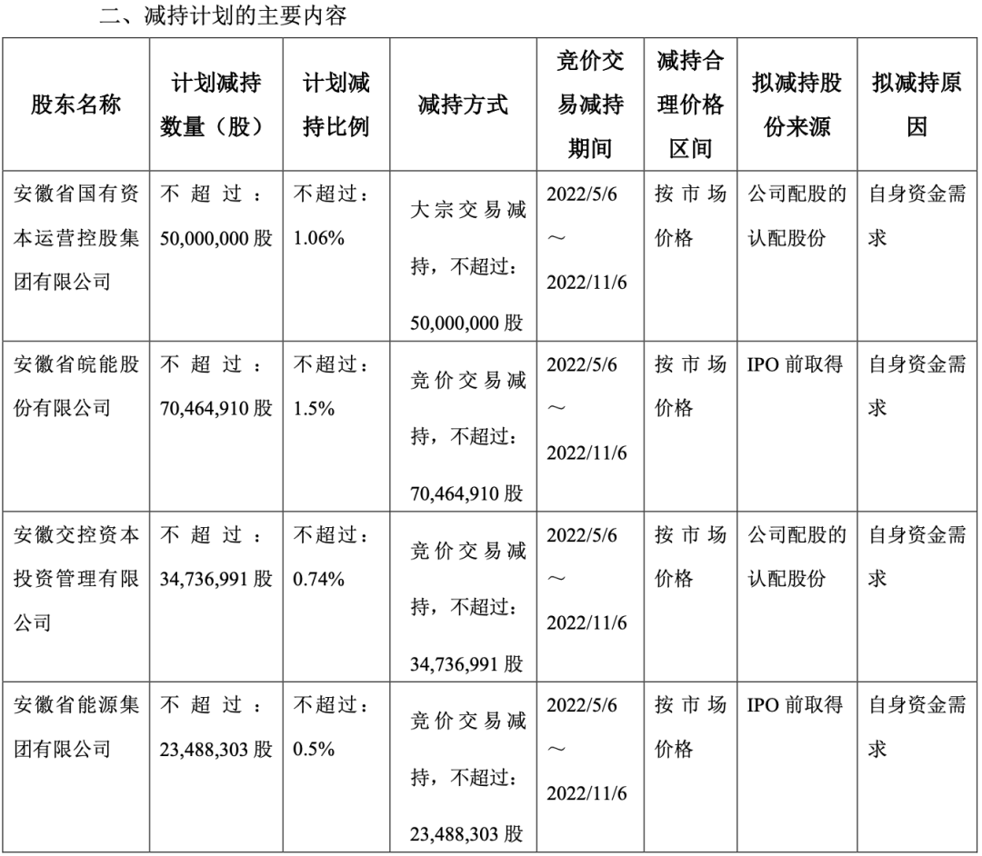 上述四家股东称,由于“自身资金需求”,计划在2022年5月6日至2022年11月6日期间,拟通过集中竞价及大宗交易方式合计减持不超过1.79亿股,即不超过股份总数的3.80%。减持期间如有派息、转股、送股、配股等除权除息事项的,减持股份数量不进行调整。