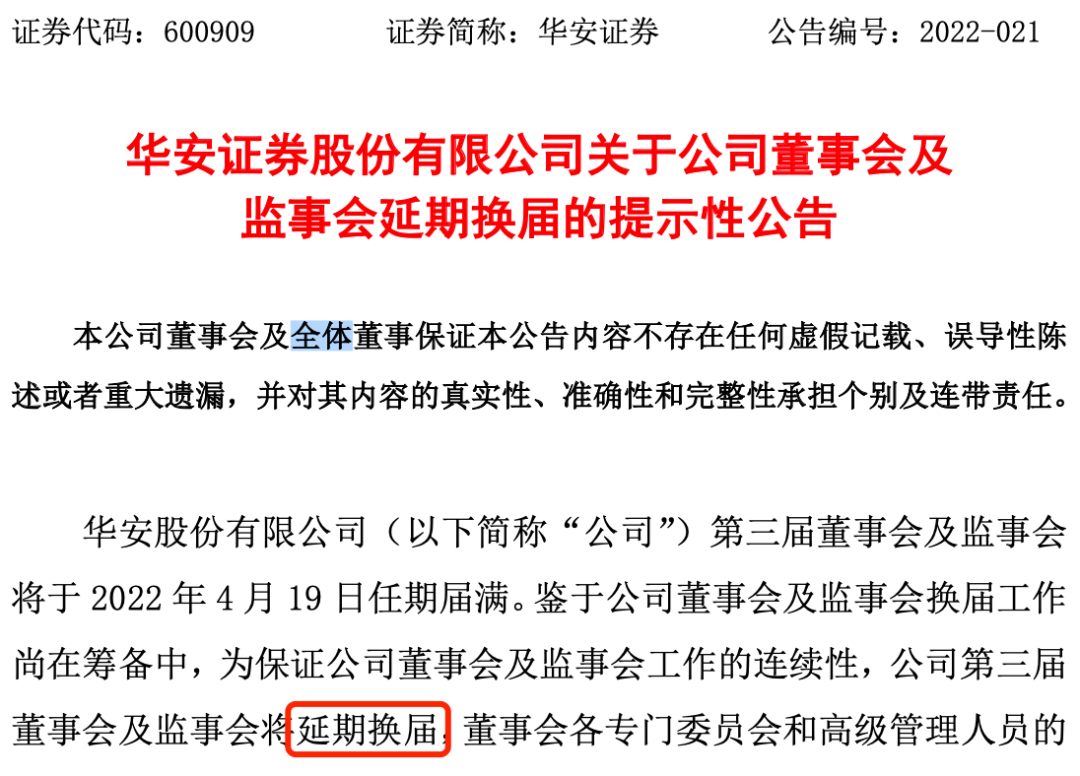 与此同时,华安证券还公告了董事会和监事会将延期换届的消息。