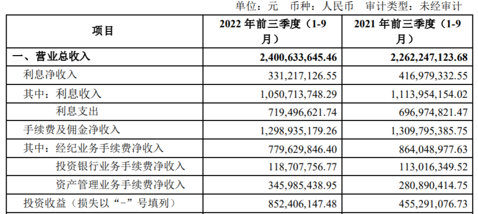 2022年前三季度,华安证券的投资收益为8.52亿元,上年同期为4.55亿元,同比增长87.22%。
