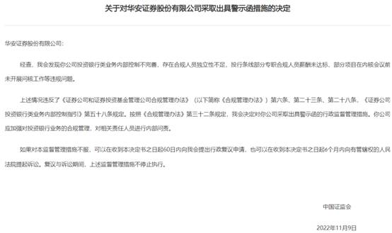 按照《合规管理办法》第三十二条规定,证监会决定对华安证券股份有限公司采取出具警示函的行政监督管理措施。华安证券股份有限公司应加强对投资银行业务的合规管理,对相关责任人员进行内部问责。