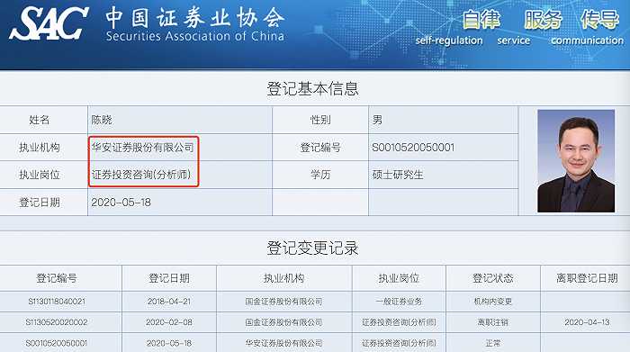 界面新闻查询中国证券业协会官网发现,目前,登记执业岗位为“证券投资咨询(分析师)”的“陈晓”仅有一人,2020年5月18日开始,陈晓在华安证券作为分析师执业。