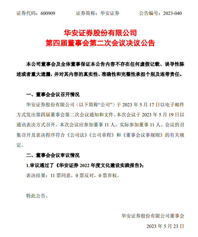 就在昨晚(5月22日),华安证券通过公告披露,于5月19日召开的第四届董事会第二次会议,审议通过了《华安证券2022年度文化建设实践报告》。