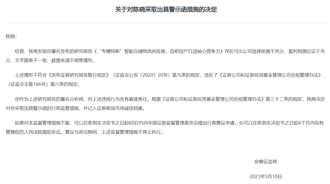 这份编号为【2023】10号的监管函披露,当事人陈晓署名发布的研究报告《“专精特新”智能仓储物流供应商,自研自产打造核心竞争力》,存在可比公司选择依据不充分、盈利预测论证不充分、文字图表不一致、数据来源不明等情形。