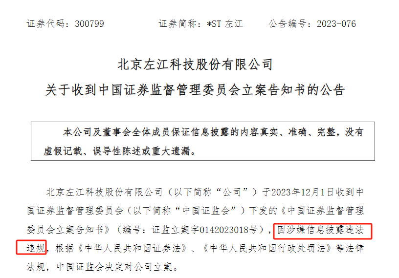12月1日,左江科技因涉嫌信息披露违法违规,收到证监会下发的立案告知书。