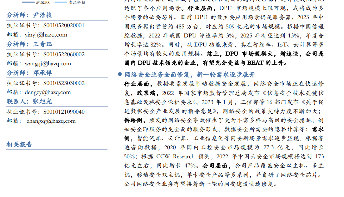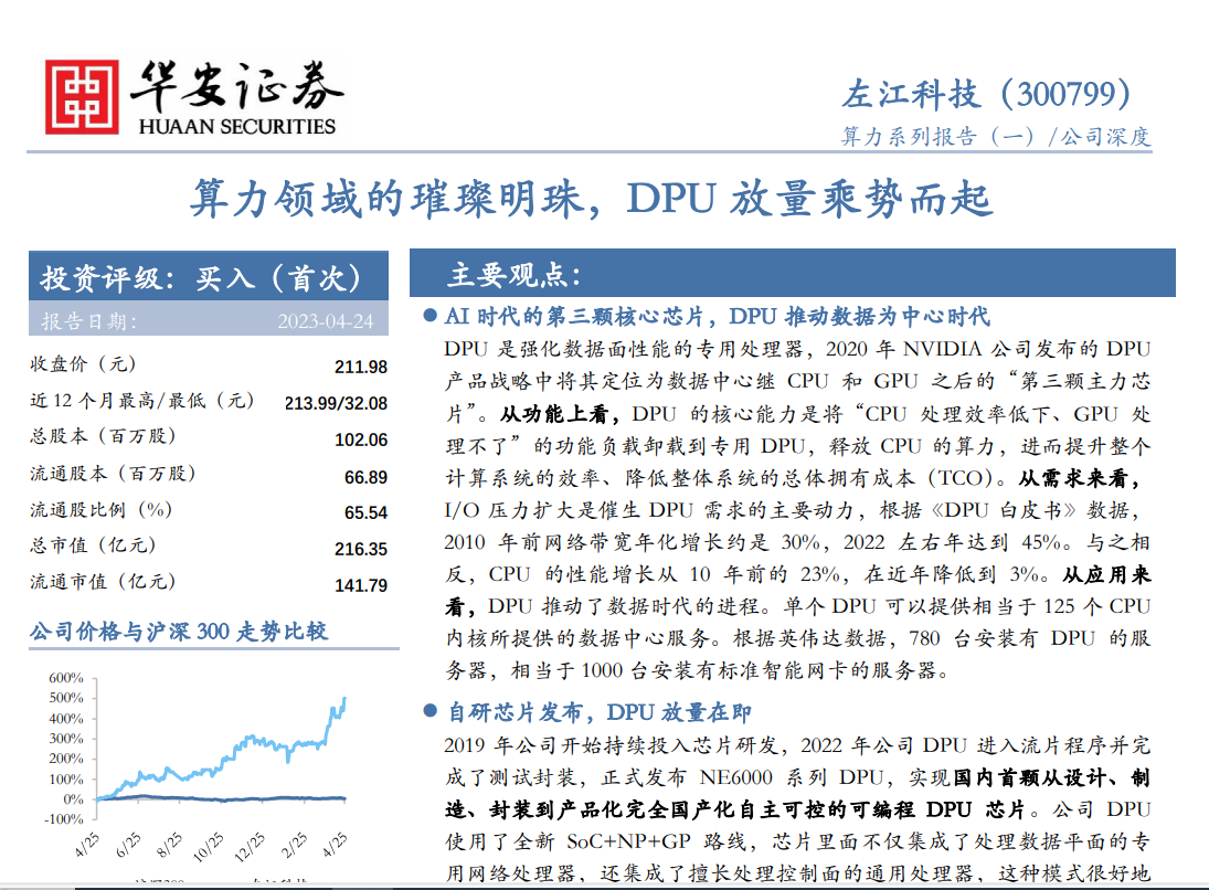 “左江科技”即曾经的“最贵ST股”——*ST左江。根据深交所公告,2023年1月31日、2月25日、3月25日,*ST左江连续三次发布公司股票交易可能被实施退市风险警示的公告。但在2023年4月25日,华安证券发布了题为《算力领域的璀璨明珠,DPU放量乘势而起》的深度研究报告,并推荐“买入”左江科技。