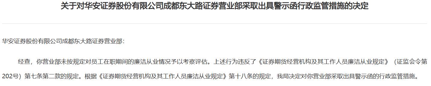 9月16日,四川证监局发布的行政监管措施显示,华安证券成都东大路证券营业部因未按规定对员工在职期间的廉洁从业情况予以考察评估,四川证监局决定对该营业部采取出具警示函的行政监管措施。