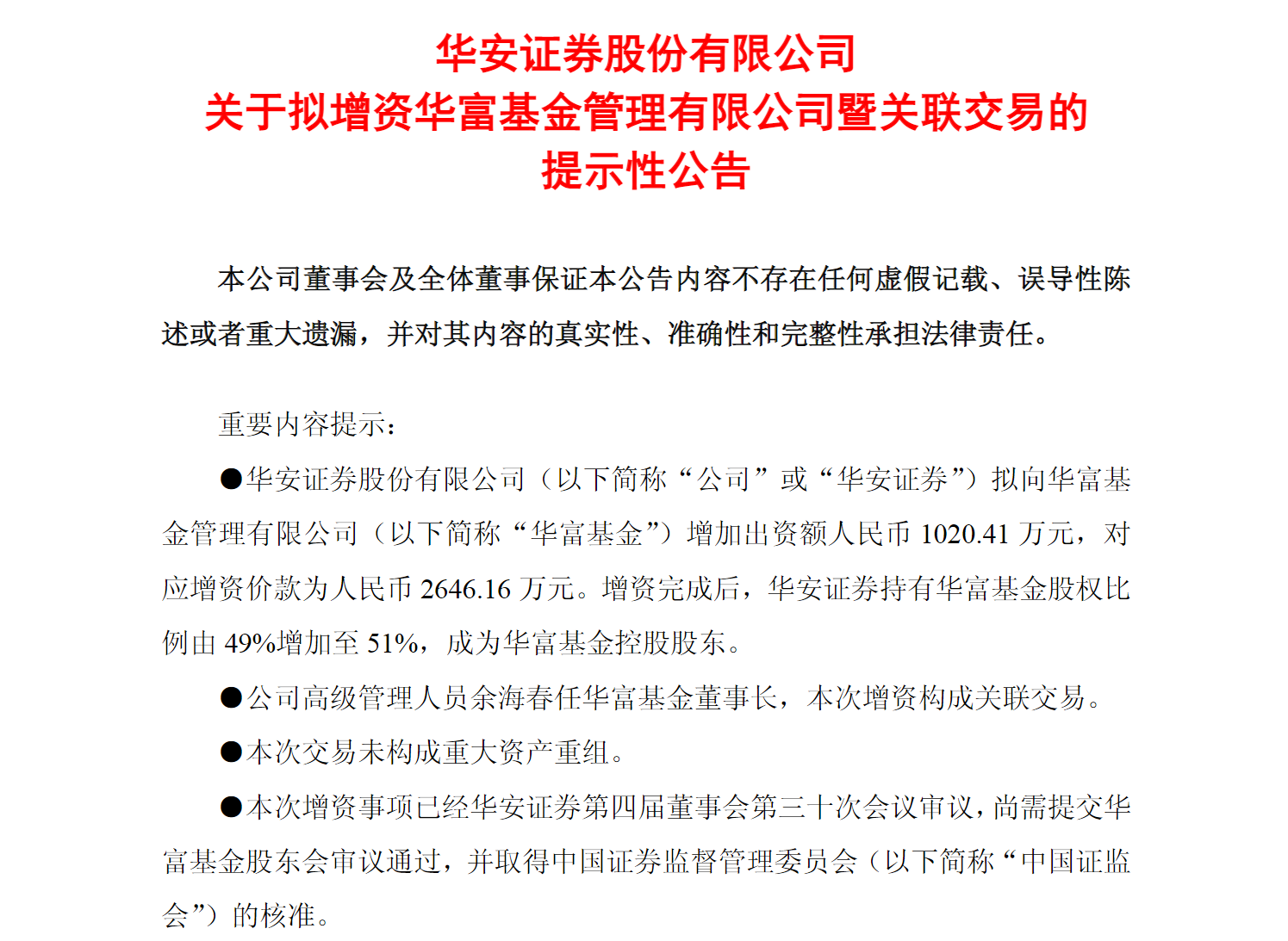 通过此次增资并控股华富基金,华安证券将获得公募基金牌照,有助于其完善财富管理业务布局,形成公募+私募、权益+固收、境内+境外的多元化财富管理产品谱系,整合客群、渠道、服务资源,增强对客户的资产配置服务能力,进一步提升核心竞争力。