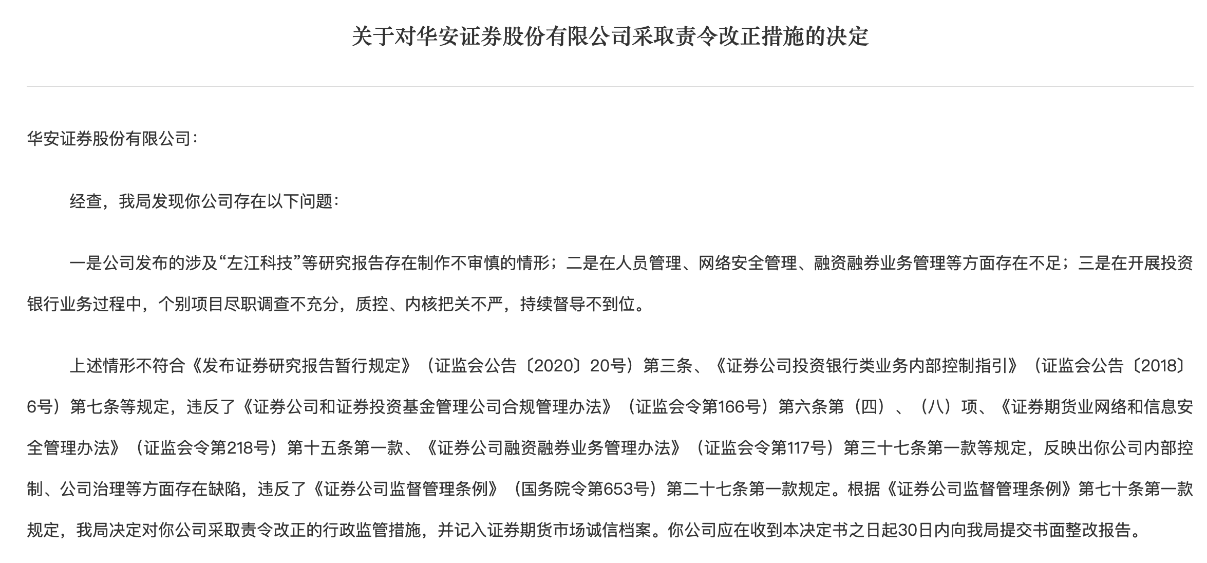 研报业务方面,2024年2月,华安证券因一份深度研报接连收到深交所和安徽证监局的双重罚单,2023年1月至3月间,深交所上市公司*ST左江连续三次发布可能被实施退市风险警示的公告,但华安证券仍在同年4月发布题为《算力领域的璀璨明珠,DPU放量乘势而起》的深度研报,并推荐“买入”该股。监管认定该研究报告“分析结论依据不充分,结论不审慎,未充分揭示投资风险”,深交所对其采取书面警示的自律监管措施,安徽证监局则采取责令改正的行政监管措施。
