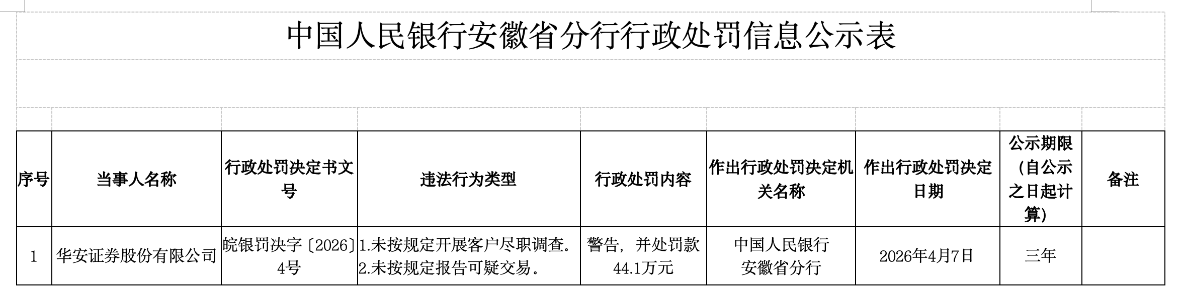 近日,中国人民银行安徽省分行发布了一则行政处罚决定,认定华安证券(600909)存在未按规定开展客户尽职调查、未按规定报告可疑交易两大违法行为,依法对其作出警告并处罚款44.1万元。