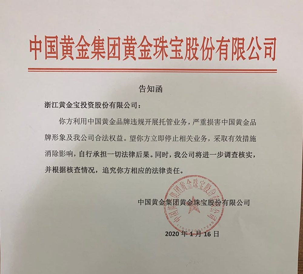 2020年1月16日,中国黄金集团黄金珠宝股份有限公司在一份《告知函》中称,浙江黄金宝投资股份有限公司(简称黄金宝公司)利用中国黄金品牌违规开展托管业务,“严重损害中国黄金品牌形象及我公司合法权益。”望对方采取有效措施消除影响,自行承担一切法律后果。