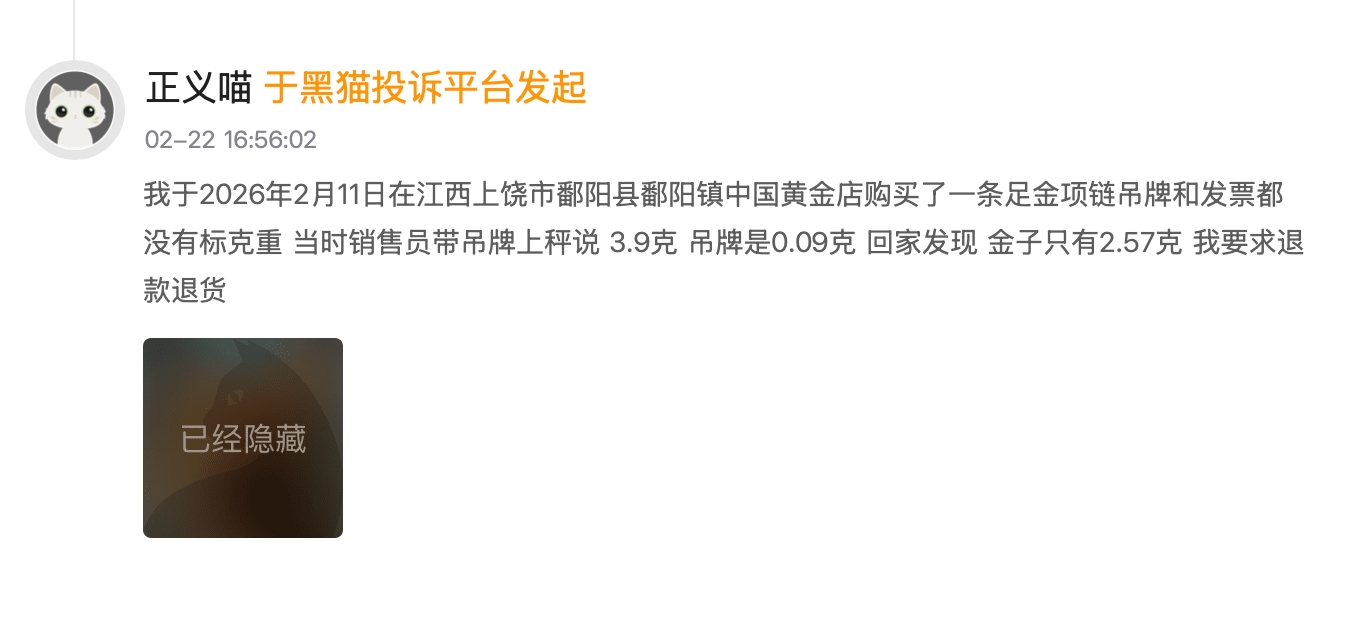 其中,有消费者称,于中国黄金一门店购买了一条足金项链,吊牌和发票都没有标克重,当时销售员带吊牌上秤说3.9克,其中吊牌是0.09克,然而,回家发现金子却只有2.57克,对此,消费者要求退款退货。