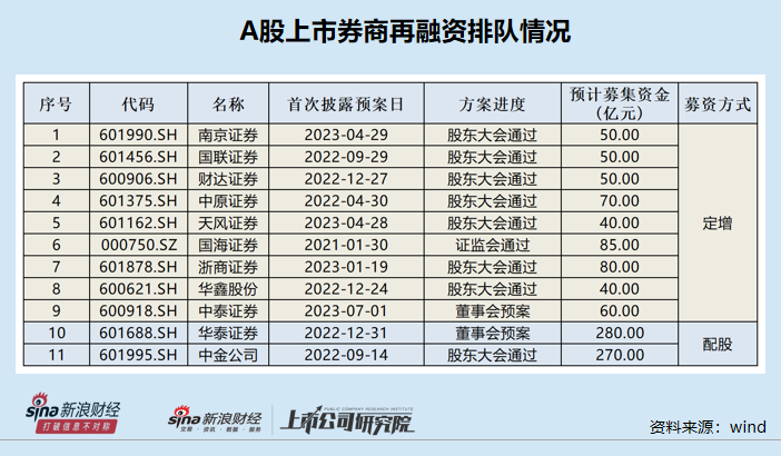 资料显示,除了中泰证券,还有8家公司正在推进定增,分别是南京证券、国联证券、财达证券、中原证券、天风证券、国海证券、浙商证券、华鑫股份,