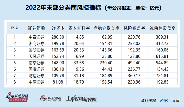 此外,与7家(华鑫股份未公布数据)进行定增的券商相比,中泰证券除资本杠杆率这项指标外,其他几项风控指标并不是最差,有的甚至排名第一,公司却还要将大部分募资用来偿债。如公司(母公司报表) 2022年的净资本在8家公司中排第一;净稳定资金率排第三;风险覆盖率、流动性覆盖率排第五。并且,中泰证券的几项风控指标离预警线还相差甚远。