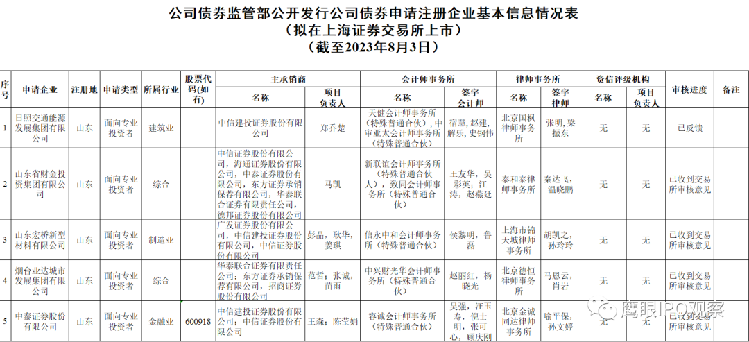 这5家企业的申请类型均为“面向专业投资者”,目前日照交通能源发展集团有限公司的审核状态为“已反馈”,其余4家均为“已收到交易所审核意见”。