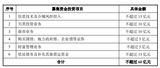 中泰证券同日发布的《向特定对象发行A股股票预案(修订稿)》显示,本次向特定对象发行A股股票募集资金总额不超过人民币60亿元(含本数),中泰证券预计在信息技术及合规风控投入不超15亿元,另类投资业务投入不超10亿元,做市业务投入不超10亿元,购买国债、地方政府债、企业债等证券业务投入不超5亿元,财富管理业务投入不超5亿元,偿还债务及补充其他营运资金不超15亿元。