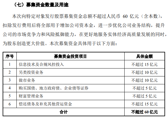 具体来看,此次募集资金拟拟使用不超过15亿元用于信息技术及合规风控投入,不超过10亿元用于另类投资业务,不超过10亿元用于做市业务,不超过5亿元用于购买国债、地方政府债、企业债等证券,不超过5亿元用于财富管理业务,不超过15亿元用于偿还债务及补充其他营运资金。