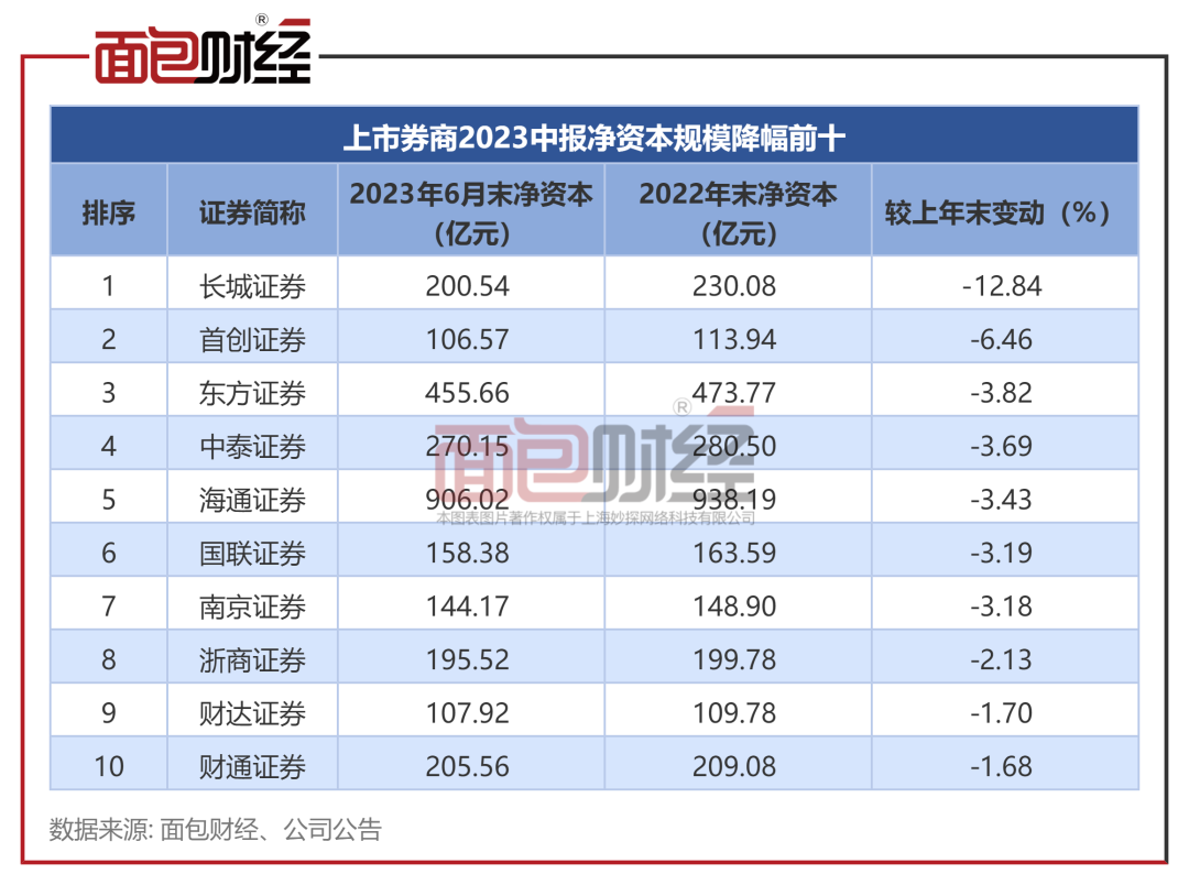 面包财经研究员梳理券商中报发现,截至2023年6月末,43家上市券商中,有16家券商的净资本规模较上年末有所下降,中泰证券净资本规模降幅排在第4位。