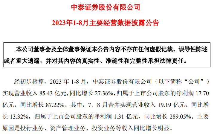 9月27日,中泰证券发布了2023年1-8月主要经营数据公告。