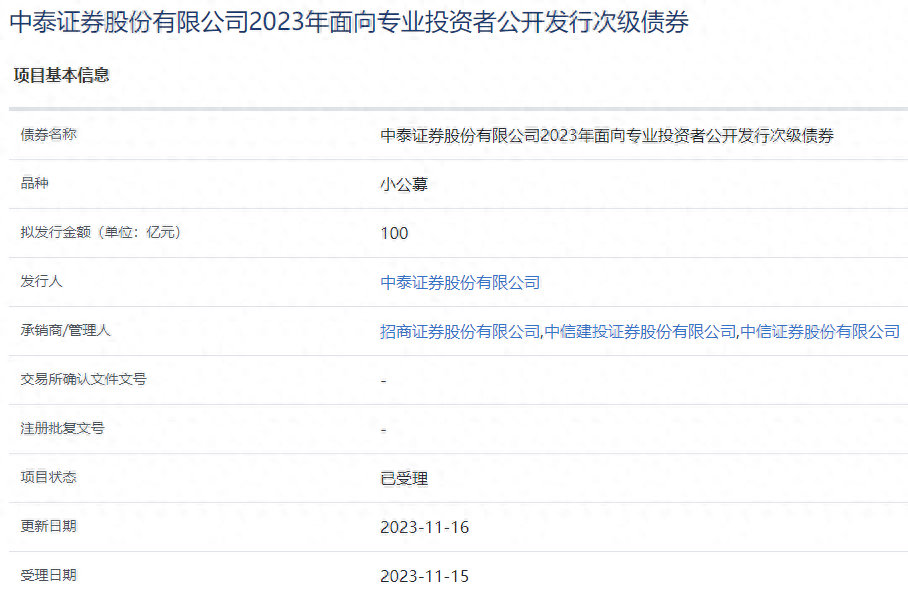 中泰证券股份有限公司2023年面向专业投资者公开发行次级债券项目,最新的项目状态为“已受理”,更新日期为11月16日。