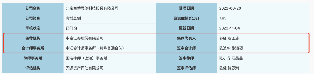 海波思创保荐机构为中泰证券股份有限公司(以下简称“中泰证券”)保荐代表人郭强,杨圣志。会计师事务所中汇会计师事务所(特殊普通合伙)签字会计师陈达华,张演硕。
