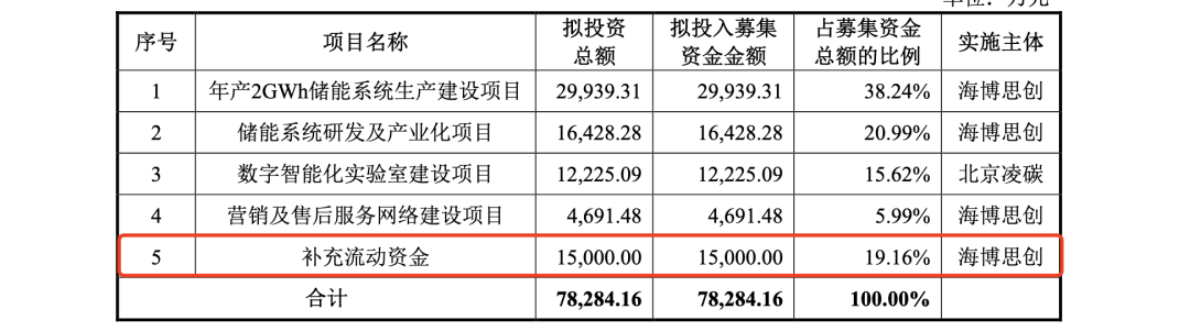 海博思创此次募集主要5个项目分别为,年产2GWh储能系统生产建设项目 2.99亿元,占比 38.24%、储能系统研发及产业化项目 1.64亿元,占比20.99%、数字智能化实验室建设项目 1.22亿元,占比15.62%、营销及售后服务网络建设项目 0.47亿元,占比 5.99%、补充流动资金 1.5亿元占比 19.16%,合计 7.83亿元。
