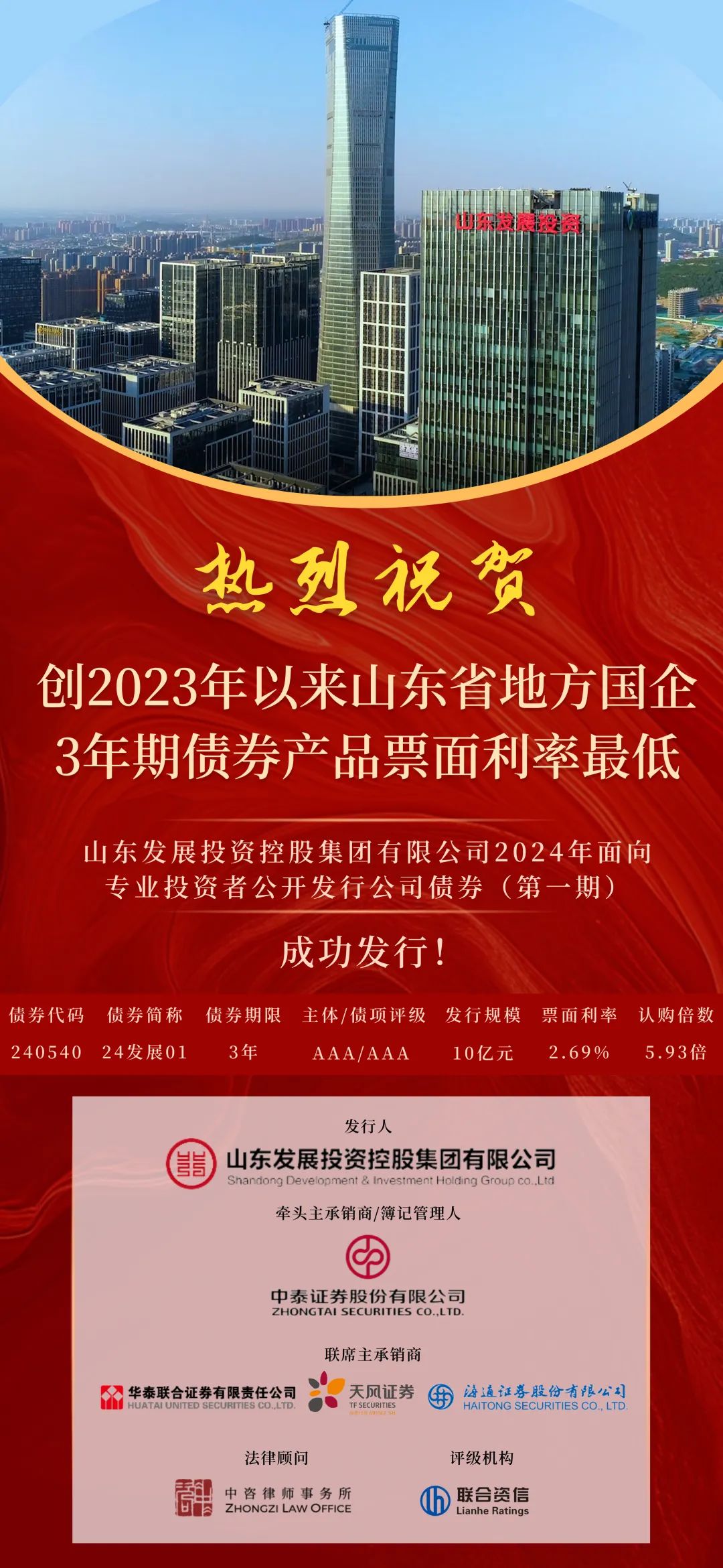 由中泰证券担任牵头主承销商/簿记管理人/受托管理人的山东发展投资控股集团有限公司(下称“山东发展投资集团”)2024年面向专业投资者公开发行公司债券(第一期)(简称“24发展01)”)于1月30日成功发行,发行规模10亿元,期限3年期。投资者认购踊跃,全场认购倍数5.93倍,最终票面利率2.69%,创2023年以来山东省地方国企3年期债券产品票面利率最低。