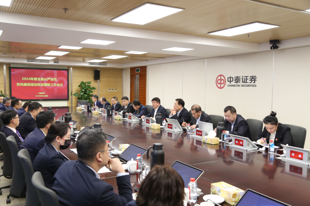 2月19日,中泰证券2024年度全面从严治党、党风廉政建设和反腐败工作会议在济南召开。会议传达学习了二十届中央纪委三次全会和省纪委十二届三次全会精神,系统总结了2023年公司全面从严治党、党风廉政建设和反腐败工作,安排部署了2024年工作任务,组织签订了2024年度党风廉政建设“一岗双责”责任书和全面从严治党责任书。公司党委书记、董事长王洪出席会议并讲话,党委常委、省纪委监委驻公司纪检监察组组长金海明主持会议并通报2023年公司纪检监察工作开展情况,省纪委监委二级调研员张小兵到会指导。