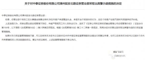 今年3月4日,因个别员工在从事基金销售业务时,存在向客户承诺赠送礼金、承诺本金不受损失的行为,且在个别客户出现亏损时向其提供经济补偿,中泰证券股份有限公司漳州延安北路证券营业部被福建证监局出具警示函。